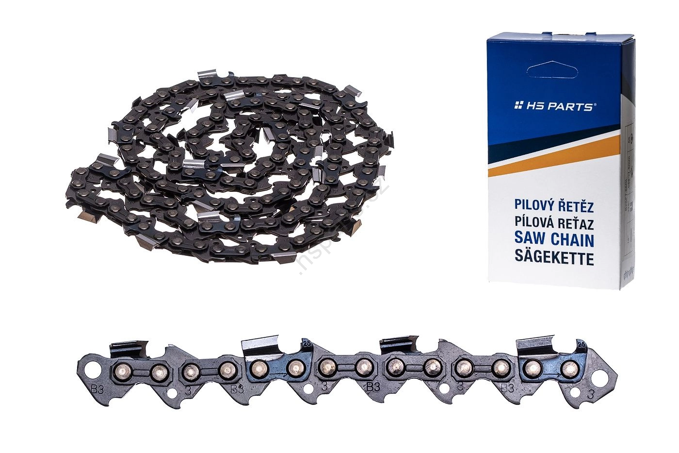 HS PARTS dodává profesionální řetězy s hranatým profilem zubu, s kulatým profilem zubu pro řezání prken, univerzálním profilem zubu a jako novinku řetěz s karbidovým zubem.